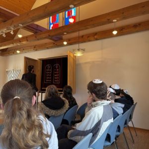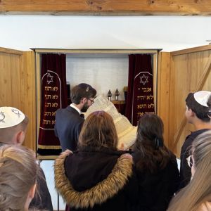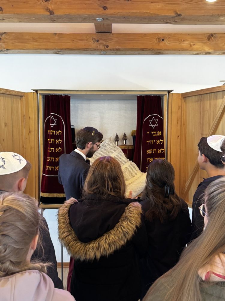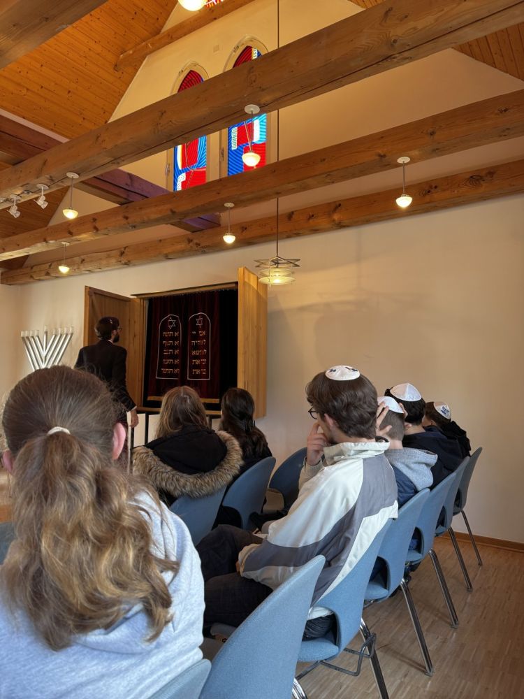 Vor dem Eingang wurde die Gruppe freundlich von Rabbiner Levi Israel Ufferfilge empfangen. Er führte die Schülerinnen und Schüler durch die Gemeinde und erklärte viele zentrale Aspekte des jüdischen Glaubens. Bevor die Synagoge betreten wurde, setzten alle männlichen Teilnehmenden eine Kippa auf – eine kleine Kopfbedeckung, die im Judentum als Zeichen der Ehrfurcht vor Gott getragen wird. In der Synagoge zeigten sich die Jugendlichen besonders beeindruckt vom Toraschrein, in dem die heiligen, handgeschriebenen Torarollen aufbewahrt werden. Sie gelten als wichtiges Symbol des Judentums und werden mit großem Respekt behandelt. Rabbiner Ufferfilge stellte außerdem die Tefillin (Gebetsriemen) sowie seinen Tallit (Gebetsmantel) vor, den er beim Gebet und zu besonderen Anlässen trägt. Ein weiteres Highlight war das Schofar – ein aus einem Widderhorn gefertigtes Blasinstrument, das zum jüdischen Neujahrsfest Rosch Haschana erklingt und mit seinem kräftigen Klang großen Eindruck hinterließ.