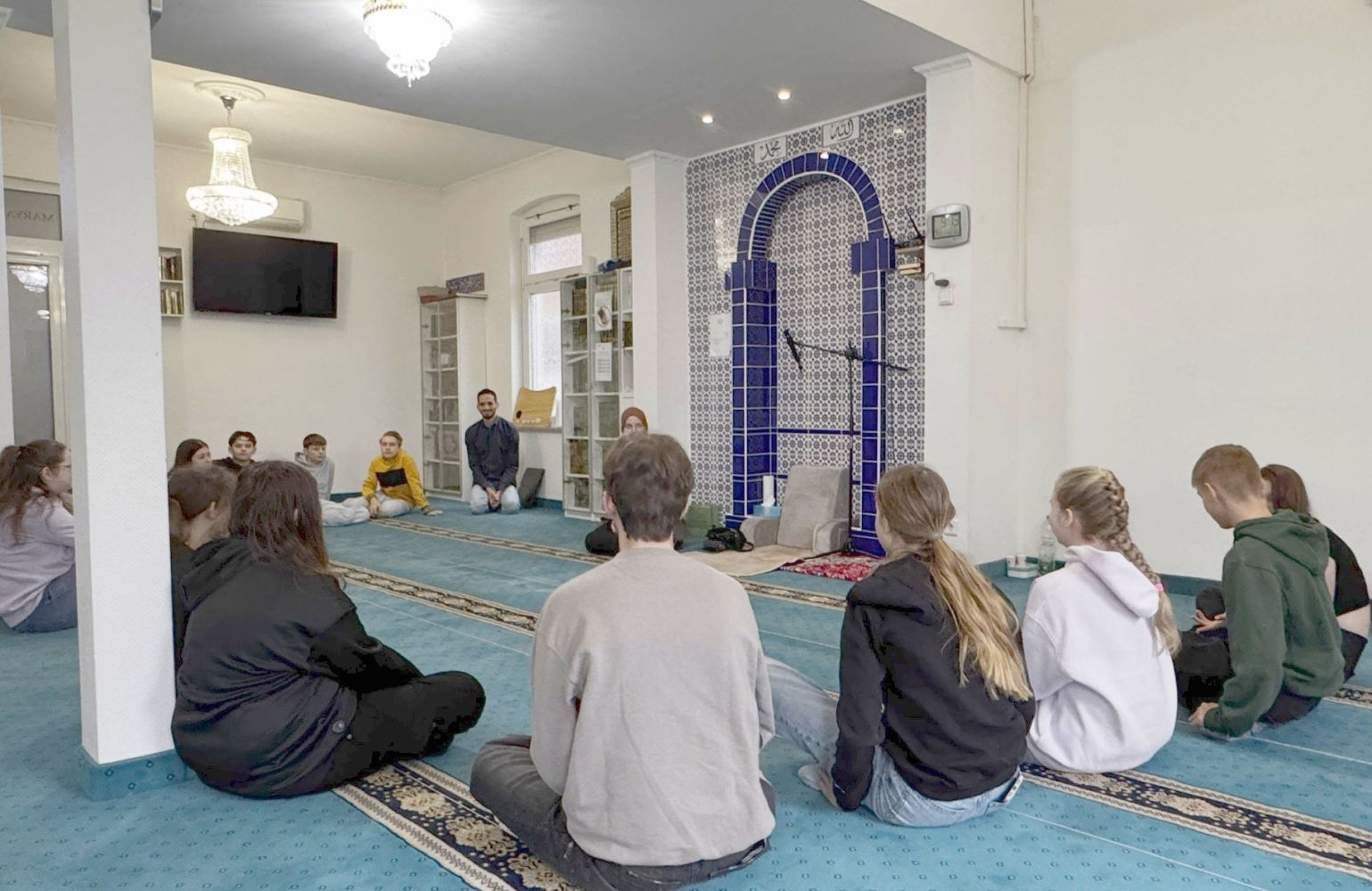 Vor der Moschee wurde die Gruppe von Frau Rocca empfangen, die in der Gemeinde für die Öffentlichkeitsarbeit zuständig ist. Bevor die Schüler:innen das Gebäude betraten, zogen sie ihre Schuhe aus, um den Gebetsteppich sauber zu halten. Nach einer Führung durch die Moschee versammelten sich alle in einem Sitzkreis vor der Mihrāb – der Gebetsnische, die die Richtung nach Mekka anzeigt und eine zentrale Rolle im Gebet spielt. In einem interessanten Gespräch gab Frau Rocca spannende Einblicke in die islamische Glaubenspraxis und das Gemeindeleben. Sie erklärte, dass Muslime mehrfach am Tag beten und dass es als besonderes Ziel gilt, den Koran auswendig zu lernen. Zudem gehört die Pilgerfahrt nach Mekka für jeden gläubigen Muslim und jede gläubige Muslimin zu den religiösen Pflichten. Besonders im Ramadan hat das Fasten eine große Bedeutung, worüber Frau Rocca ebenfalls ausführlich informierte.